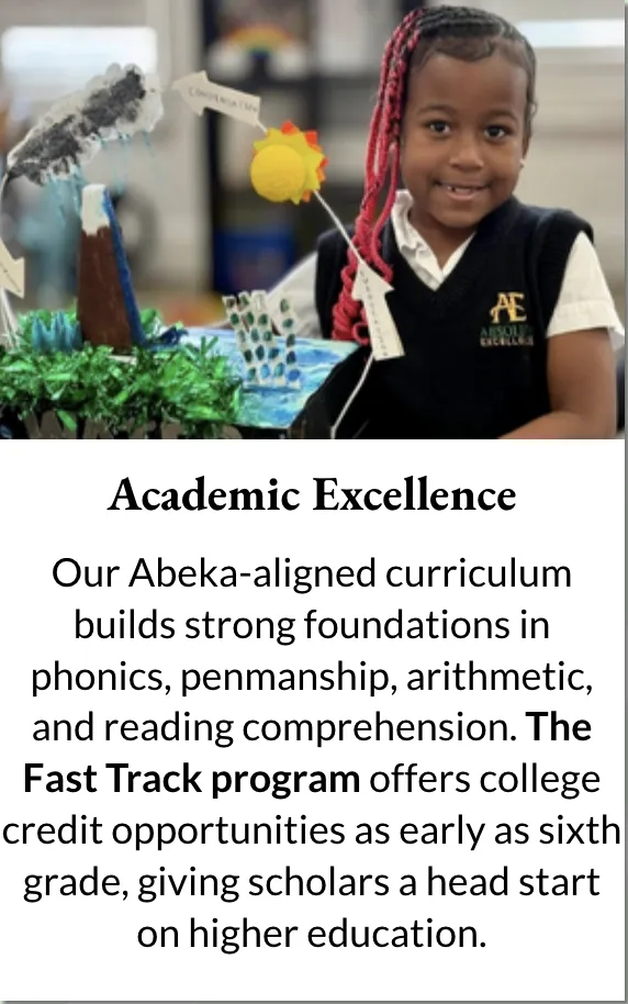 At Absolute Excellence Preparatory Academy, we are more than just a private Christian school—we are a nurturing, faith-centered academy committed to empowering scholars to achieve academic success, build moral character, and lead with compassion.