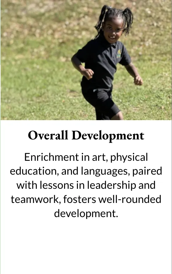 Enrichment in art, physical education, and languages, paired with lessons in leadership and teamwork, fosters well-rounded development.